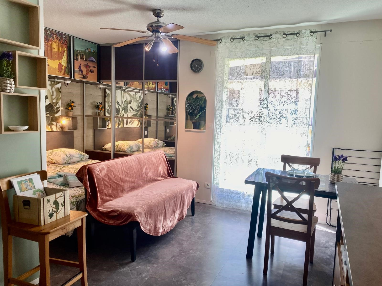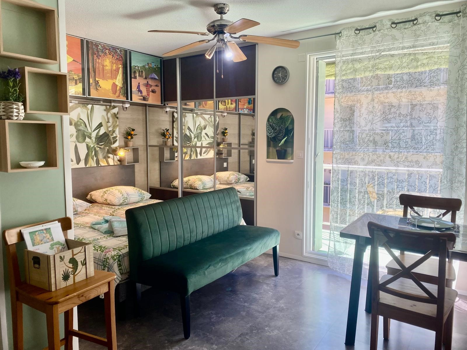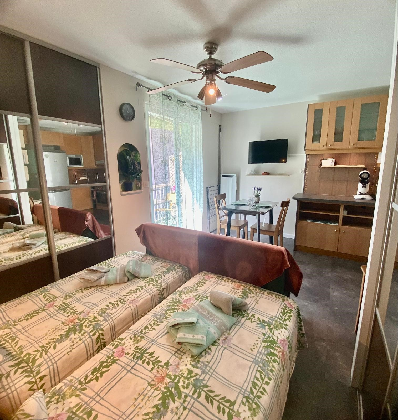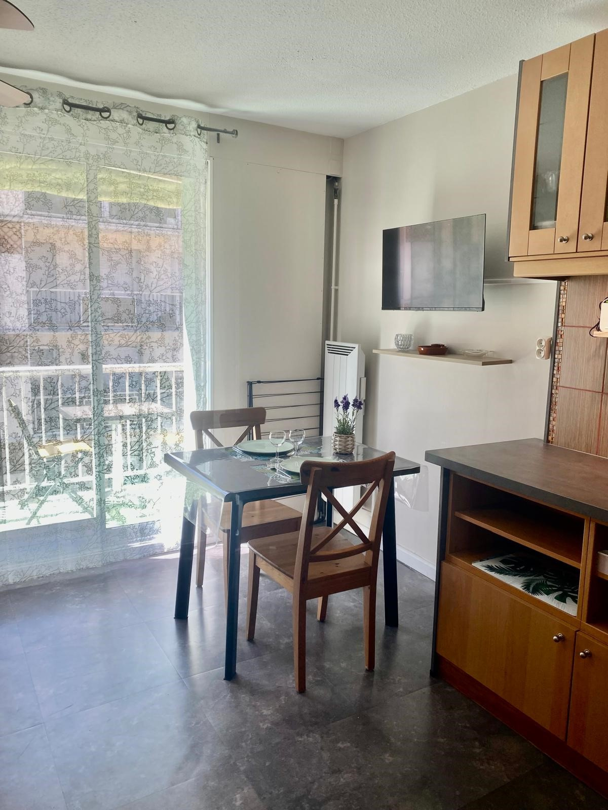 LM105 - Rés. Marie-Eugénie- Bât B - n°38- 3e étage Studio prévu pour 2 personnes d'environ 23 m² - Balcon au sud - Chauffage individuel électrique - WIFI Situé à 200 m des cures - 50 m du centre ville - meublé classé 3 étoiles LINGE DE MAISON COMPRIS DANS LE PRIX (DRAPS, SERVIETTES...) DESCRIPTIF : - ENTREE : miroir - placard de rangement - commode - boîte à clefs - escabeau - caddy - aspirateur - COIN CUISINE EQUIPEE : évier - réfrigérateur/congélateur - ustensiles usuels - 3 plaques à induction - hotte aspirante - bouilloire - four - micro-ondes - grille-pain - éléments de rangement - autocuiseur - cafetière électrique - 1 table + 2 chaises - 1 table - 2 chaises - COIN SEJOUR/CHAMBRE : armoire:penderie - lit en 140 - 2 chevets + 2 lampes - horloge - plante - 2 fauteuils osier - TV écran/plat - lecteur DVD - séchoir à linge - radiateur/pied - ventilateur - SALLE D'EAU : douche - armoire avec vasque - lave-linge - meuble de rangement - 1 poubelle - W.C - sèche-cheveux - W.C : meuble balcon : 5m² avec salon de jardin ( 2 tables - 2 chaise et 2 relax ) store banne Emplacement de parking (compris dans le prix (Avenue général de Gaulle)) ou à 200 m à l 'extérieur emplacement privatif devant le 65 avenue du vallespir Caution: 180€ à régler sur place à l'arrivée. Tarif semaines : Novembre à Mars : 230€ Avril à Mai : 260€ Juin : 265€ et Octobre : 290€ Juillet à Septembre : 290 € - Réduction de 10% sur 2 semaines - Réduction de 15% sur 3 semaines