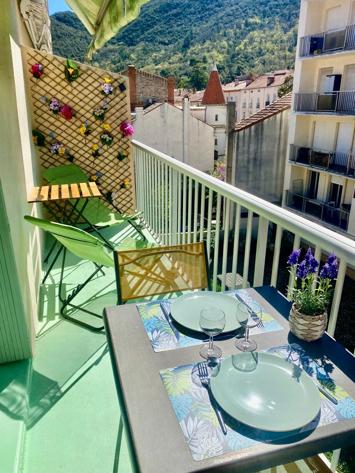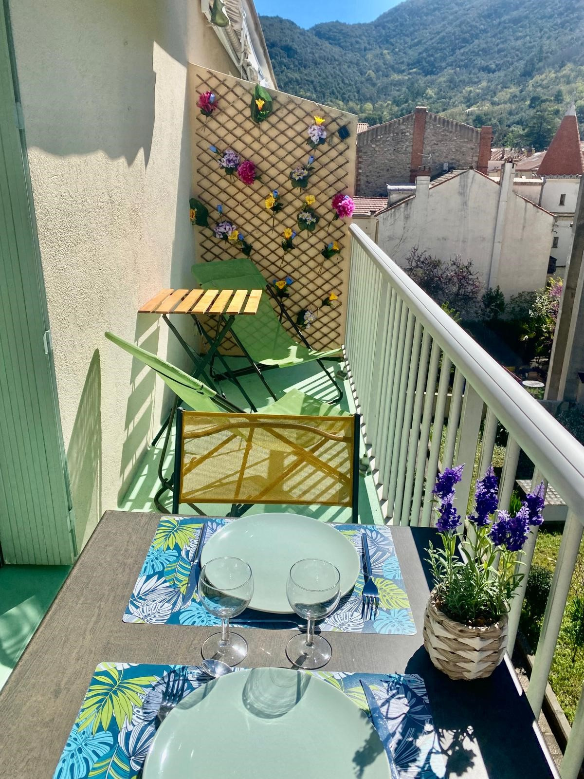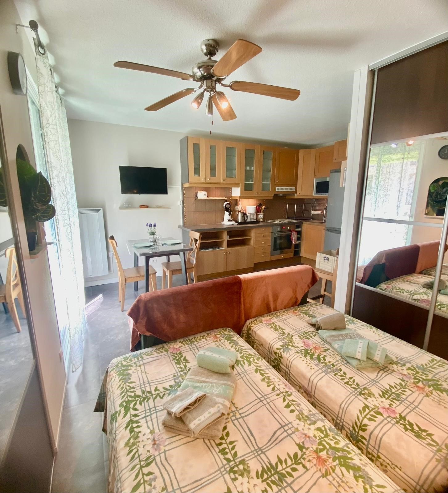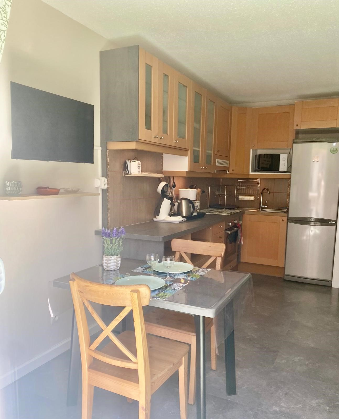 LM105 - Rés. Marie-Eugénie- Bât B - n°38- 3e étage Studio prévu pour 2 personnes d'environ 23 m² - Balcon au sud - Chauffage individuel électrique - WIFI Situé à 200 m des cures - 50 m du centre ville - meublé classé 3 étoiles LINGE DE MAISON COMPRIS DANS LE PRIX (DRAPS, SERVIETTES...) DESCRIPTIF : - ENTREE : miroir - placard de rangement - commode - boîte à clefs - escabeau - caddy - aspirateur - COIN CUISINE EQUIPEE : évier - réfrigérateur/congélateur - ustensiles usuels - 3 plaques à induction - hotte aspirante - bouilloire - four - micro-ondes - grille-pain - éléments de rangement - autocuiseur - cafetière électrique - 1 table + 2 chaises - 1 table - 2 chaises - COIN SEJOUR/CHAMBRE : armoire:penderie - lit en 140 - 2 chevets + 2 lampes - horloge - plante - 2 fauteuils osier - TV écran/plat - lecteur DVD - séchoir à linge - radiateur/pied - ventilateur - SALLE D'EAU : douche - armoire avec vasque - lave-linge - meuble de rangement - 1 poubelle - W.C - sèche-cheveux - W.C : meuble balcon : 5m² avec salon de jardin ( 2 tables - 2 chaise et 2 relax ) store banne Emplacement de parking (compris dans le prix (Avenue général de Gaulle)) ou à 200 m à l 'extérieur emplacement privatif devant le 65 avenue du vallespir Caution: 180€ à régler sur place à l'arrivée. Tarif semaines : Novembre à Mars : 230€ Avril à Mai : 260€ Juin : 265€ et Octobre : 290€ Juillet à Septembre : 290 € - Réduction de 10% sur 2 semaines - Réduction de 15% sur 3 semaines