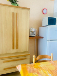 - COIN CUISINE : évier - réfrigérateur + congélateur - ustensiles usuels - éléments de rangement - plaques de cuisson électrique - mini four - cafetière électrique - micro-ondes